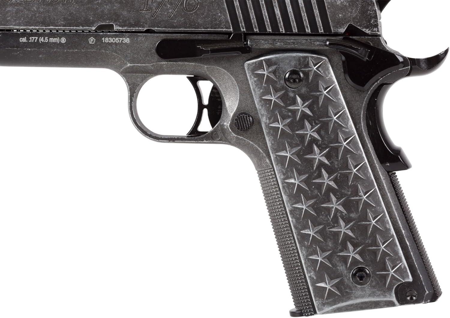 DURABLE CO2 BB AIR PISTOL – A full-size centerfire pistol inspired by a rich, patriotic history, the BB pistol version of this uniquely American handgun features custom grips adorned with 50 stars (25 per side) that represent each state of the Union