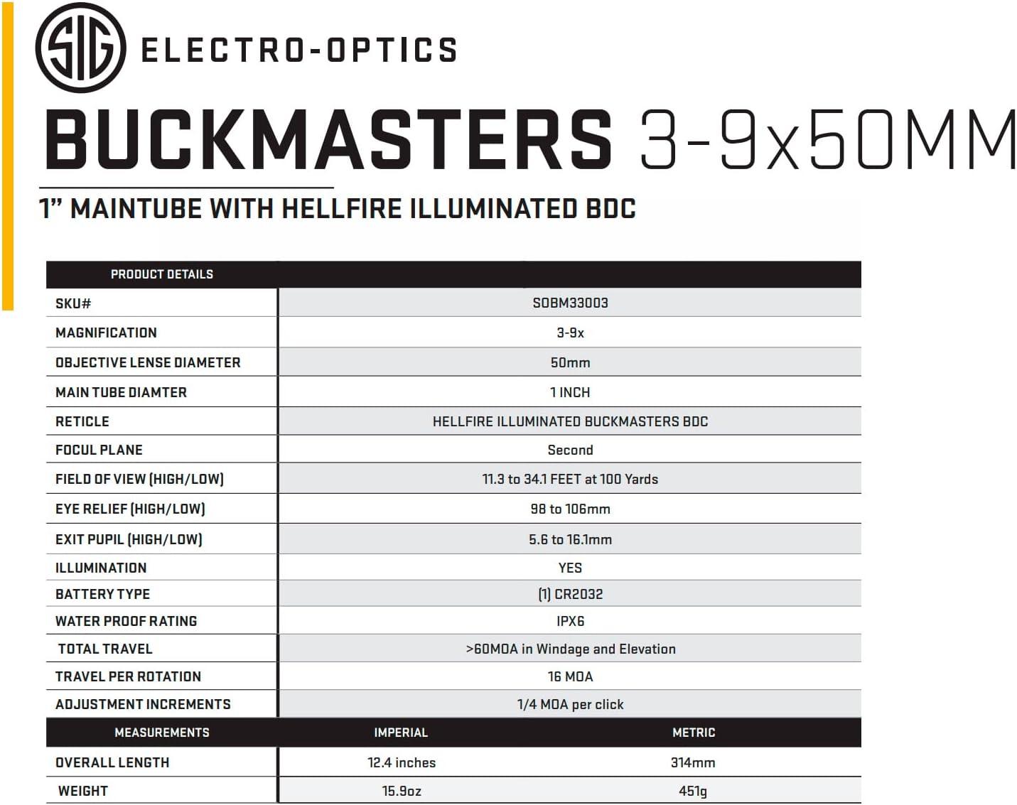 SIG SAUER Buckmasters 3-9x50mm 1" Tube Second Focal Plane/SFP/F2 Durable Shockproof Waterproof Fogproof Black Riflescope(Hellfire Buckmasters BDC Illuminated Reticle)