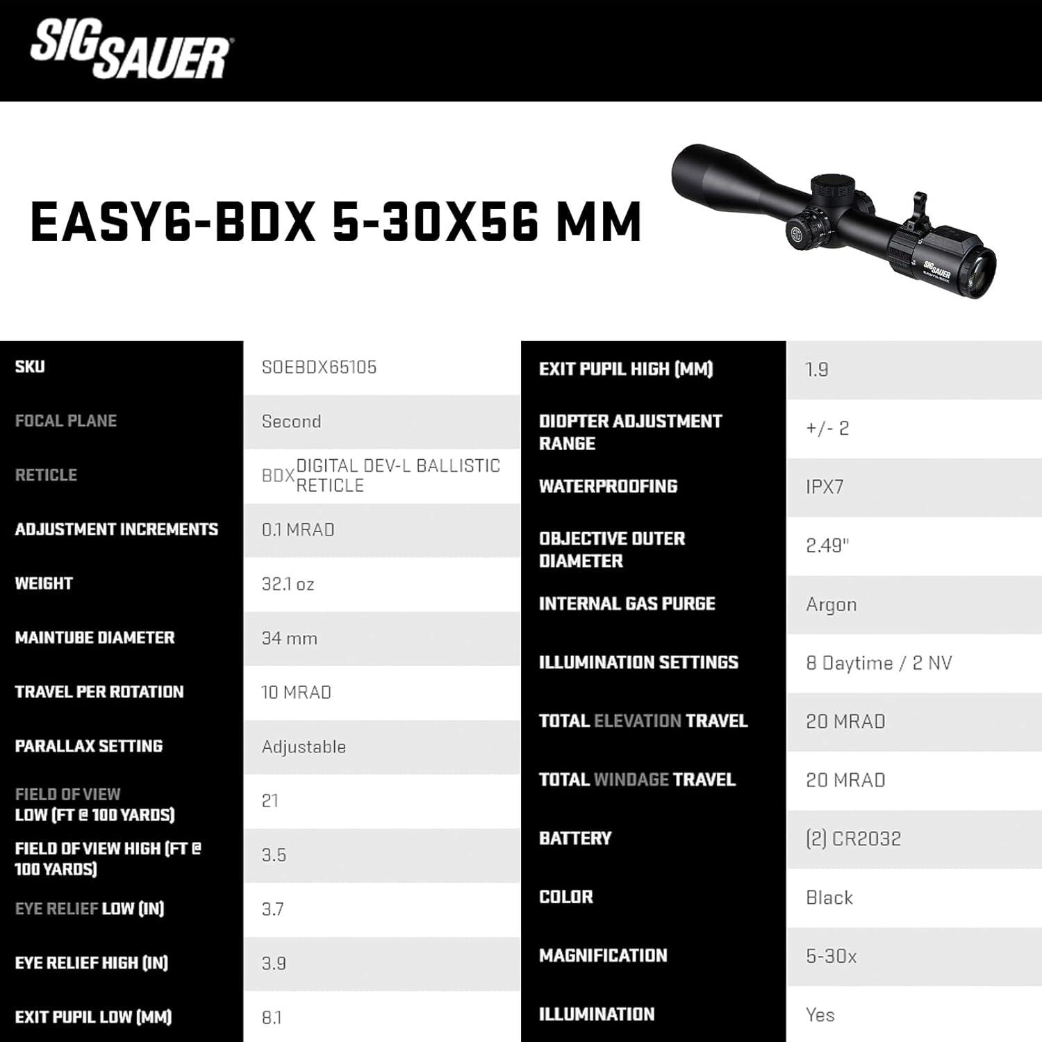 SIG SAUER EASY6-BDX RIFLESCOPE: The Sig Sauer EASY6 BDX Riflescope is the ideal solution for shooting, tactical engagements, and hunting with 6x times optical zoom and illumination in a 34mm one-piece maintube. Low-dispersion glass provides exceptional optical clarity. Built upon SIERRA6 award-winning technology, and the BDX Ballistic Data Xchange technology, the EASY6 family of tactical riflescopes provides the marksmen with an intelligent auto holdover specific to their ballistics, target, and environment. Pairing the EASY6 gun scope to a BDX-equipped rangefinder allows users to bring the capability of Applied Ballistics into the field without the need for a mobile device. MAIN FEATURES: – BDX 2.0 and Onboard, User Configurable, SmartBDC with 9 Ballistic Groups; – Integrated BDX Ballistic Data Xchange; – Automatic Holdover Dot displayed on a Digital Focal Plane; – KinETHIC Kinetic Energy Indicator; – LevelPlex Electronic System; ABOUT SIG SAUER: SIG SAUER is an ISO 9001-certified company with over 2,000 employees. In our world-class facilities, we build the toughest, most precise guns, optics, ammunition, and airguns. We do this because we share the same drive to be the best, the same love of freedom, and the same unwillingness to compromise – as those who choose SIG.