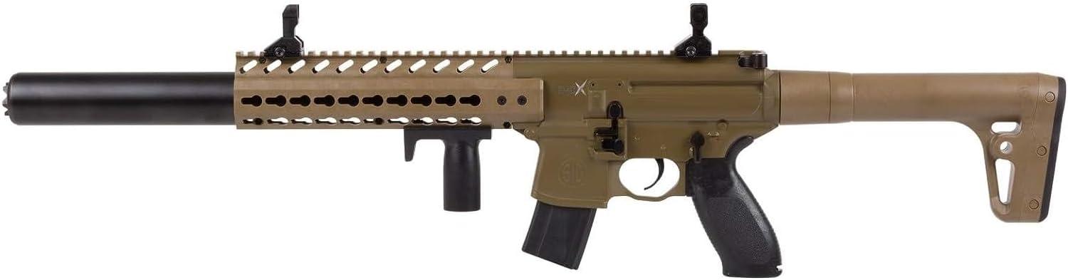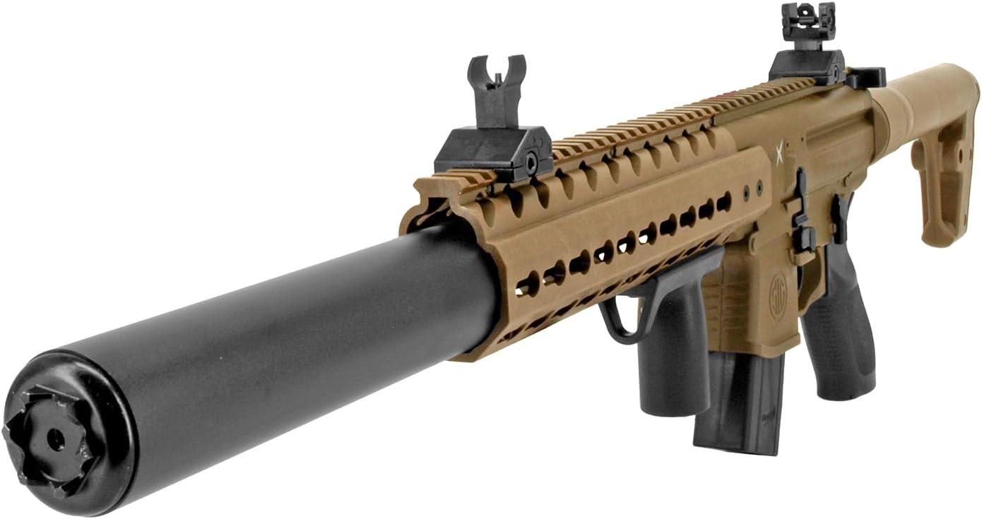 TOP QUALITY – Chambered in .177 pellet, this SIG SAUER airgun features an 18″ rifled steel barrel, synthetic handguard, Picatinny rail, tactical front grip, flip-up front and rear sights; 30rd Pellet Magazine Included