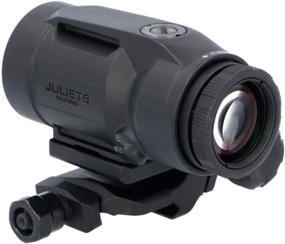 VERSATILE ADAPTABILITY – The red dot shooting sight features an analog rotary illumination dial with 12 brightness settings (10 daylight and 2 NV) for precision in all light conditions; The JULIET5-MICRO magnifiers's 90-degree push-button flip-to-side mount allows for quick adjustments, and seamless transitioning between close-range and mid-range targets