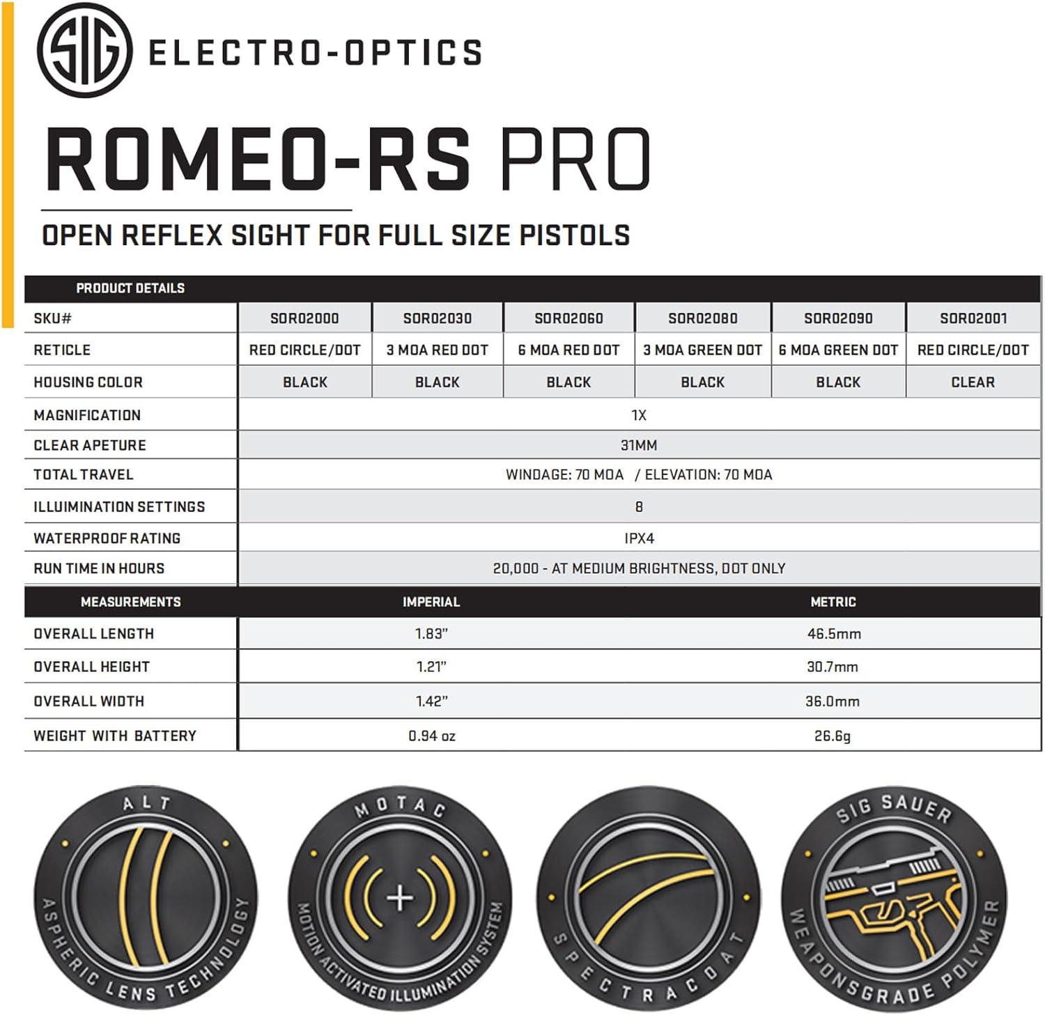 SIG SAUER Romeo-RS PRO Reinforced Steel 8 Brightness Modes Pistol Dot Sight with Aspherical Glass Lens | Compatible with Optic Ready P320, P226 & P229 – Red Dot/Green Dot Options(Black Housing)