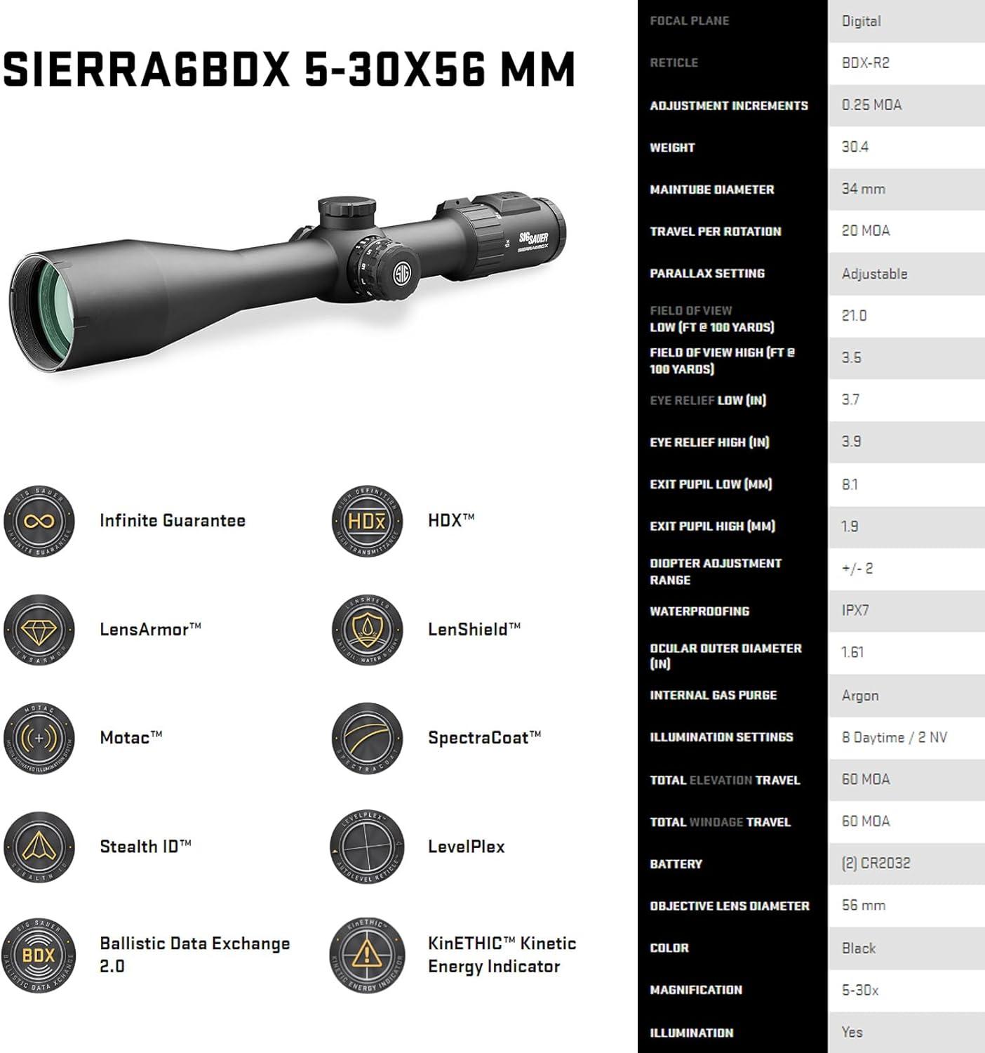 SUPERIOR LIGHT TRANSMISSION – This 5-30x56mm riflescope with 34mm maintube features a digital focal plane BDX-R2 reticle; The advanced HDX 6x Optical System provides high optical quality, along with an integrated BDX 2.0 with up to 95% light transmission