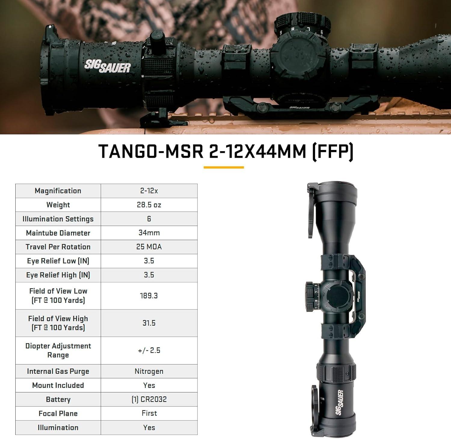 TANGO-MSR 2-12X44MM – Expanding SIG's extensive line of riflescopes to incorporate high-magnification capability, the TANGO-MSR 2-12x44mm First Focal Plane scope provides an incredible value for the recreational shooter; This 34mm maintube diameter shooting scope features a high-performance 6x optical system with low dispersion glass, ensuring crystal-clear images and precise targeting