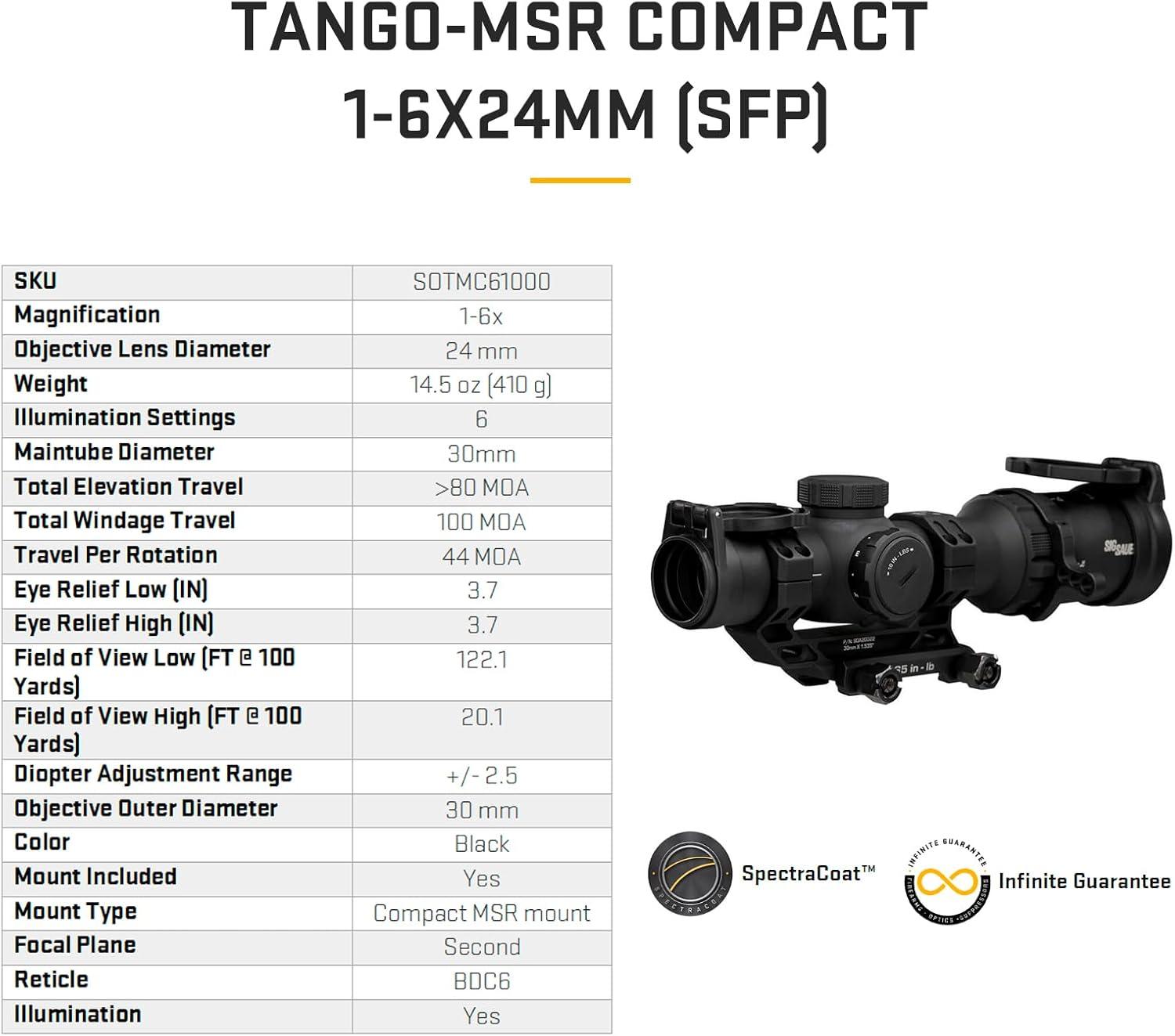 SIG SAUER Tango-MSR Compact LPVO 1-6×24 30mm Tube Second Focal Plane/SFP/F2 Shockproof Waterproof Tactical Riflescope | Illuminated BDC-6 Reticle, Alpha-MSR Mount, Flip-Back Caps Included, SOTMC61000