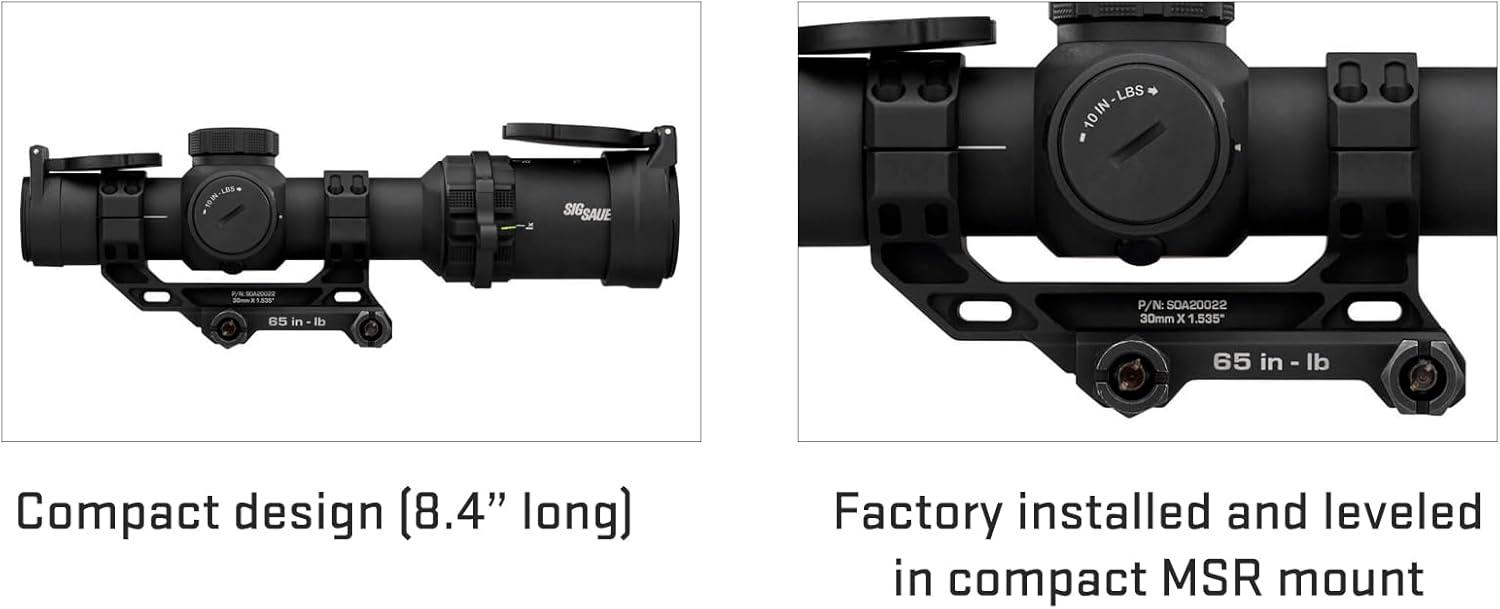 ULTRA-COMPACT, FULLY MOUNTED, MISSION-READY – Engineered for streamlined performance, the SIG SAUER TANGO-MSR COMPACT 1-6×24 Riflescope delivers maximum utility in a sleek, lightweight package; Measuring just 8.4 inches long and weighing a mere 14.5 oz (410g), this compact LPVO is purpose-built for agility & speed; Outfitted with a factory-installed, pre-leveled ALPHA-MSR aluminum cantilever mount, this SFP/F2 hunting scope is ready to run right out of the box