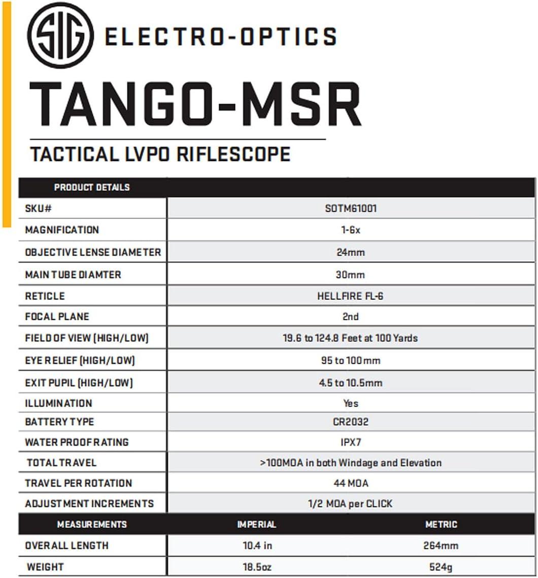 SIG SAUER Tango-MSR LPVO 1-6X24 30mm Tube F2 / Second Focal Plane Riflescope with Hellfire Illuminated FL-6 Reticle - Durable Waterproof Fogproof Black Hunting Rifle Scope - Lens Covers Included