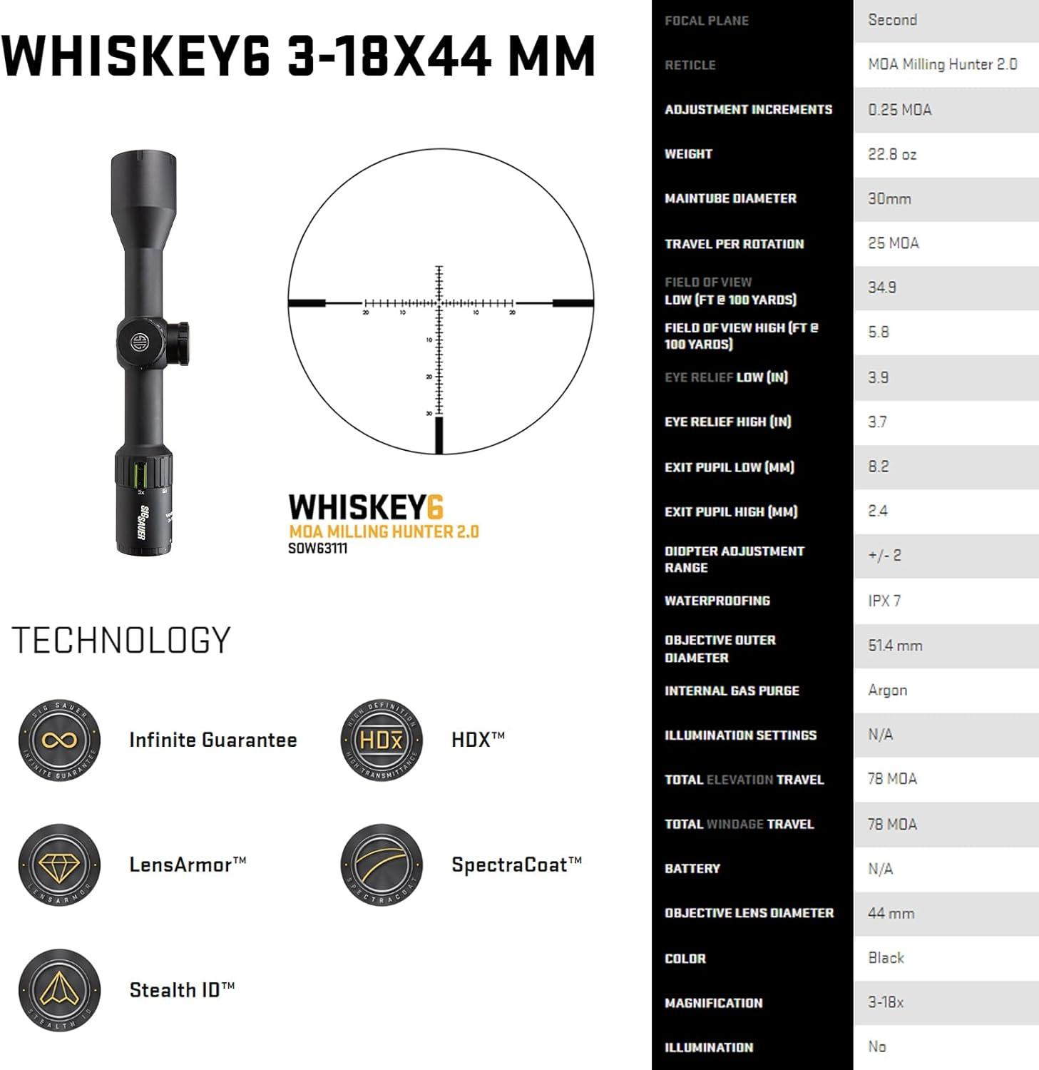 SIG SAUER WHISKEY6 3-18X44 MM RIFLESCOPE: Introducing the WHISKEY6 Riflescope from Sig Sauer. It delivers improved clarity, resolution, and light transmission from the original WHISKEY5 all while reducing the overall weight by up to 25%. Designed in Oregon by the Sig Sauer Electro-Optics team, the WHISKEY6 gun scope brings a new level of quality and performance to the flagship line of Sig Sauer hunting riflescopes, available in a 3-18×44 with a low profile design. MAIN FEATURES: – HDX Optics With Extra-Low Dispersion Glass Provide High Transmittance; – Superior Optical Clarity and Light Transmission; – Removable Throw Leaver For Quick Magnification Changes; – Side Focus Adjustable From 45 Yards To Infinity; – Dependable waterproofing and fog-proof performance; ABOUT SIG SAUER: SIG SAUER is an ISO 9001-certified company with over 2,000 employees. Our mission is to be a long-term partner to our customers, recognized for the quality and value of our products and the reliability of our commitments. In our world-class facilities, we build the most precise guns, optics, ammunition, and airguns. We do this because we share the same drive to be the best, the same love of freedom, and the same unwillingness to compromise – as those who choose SIG.